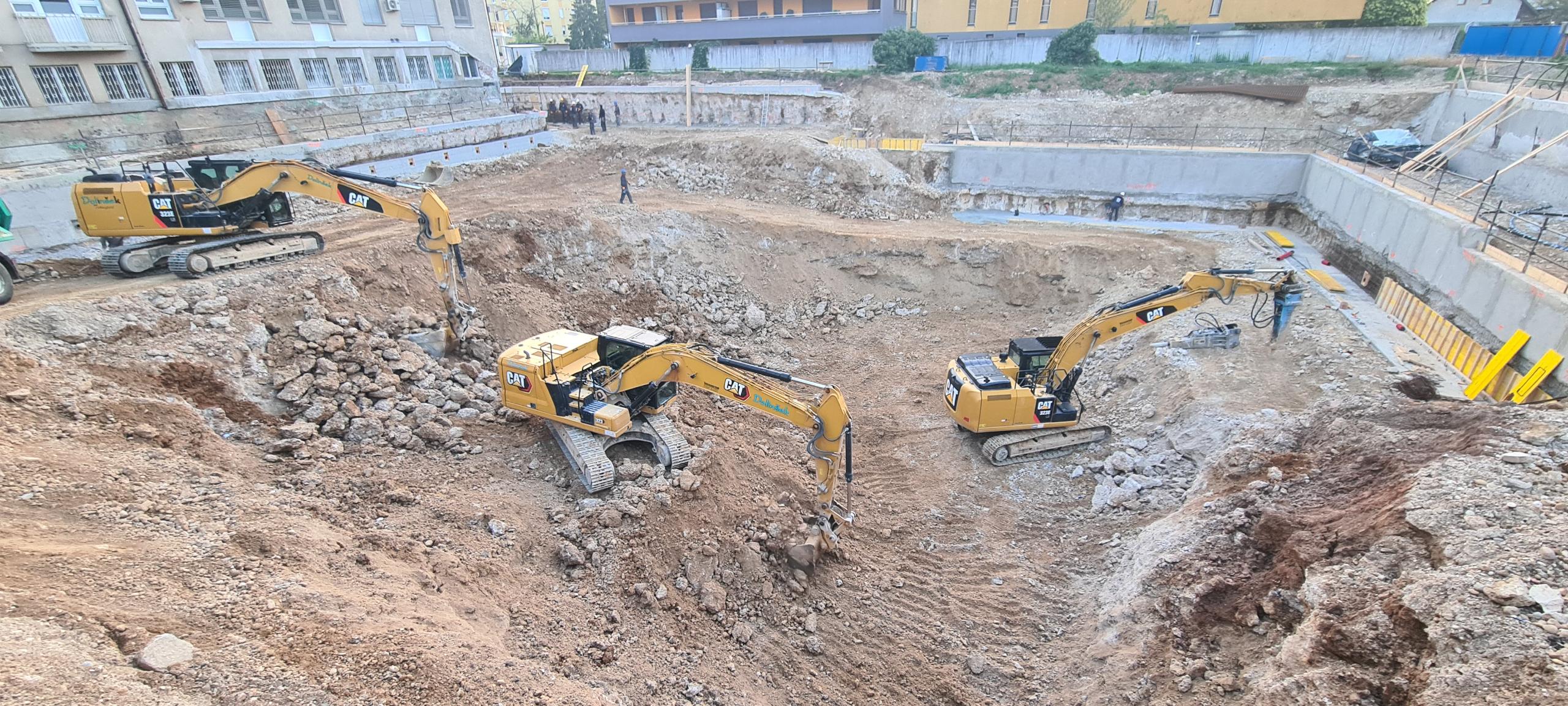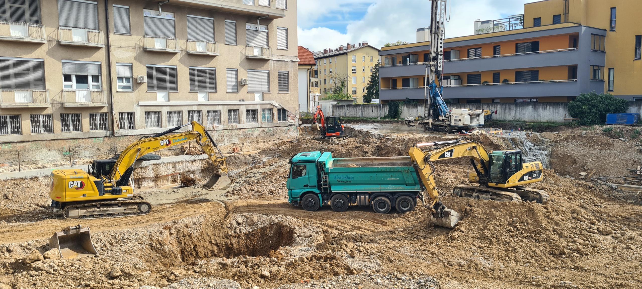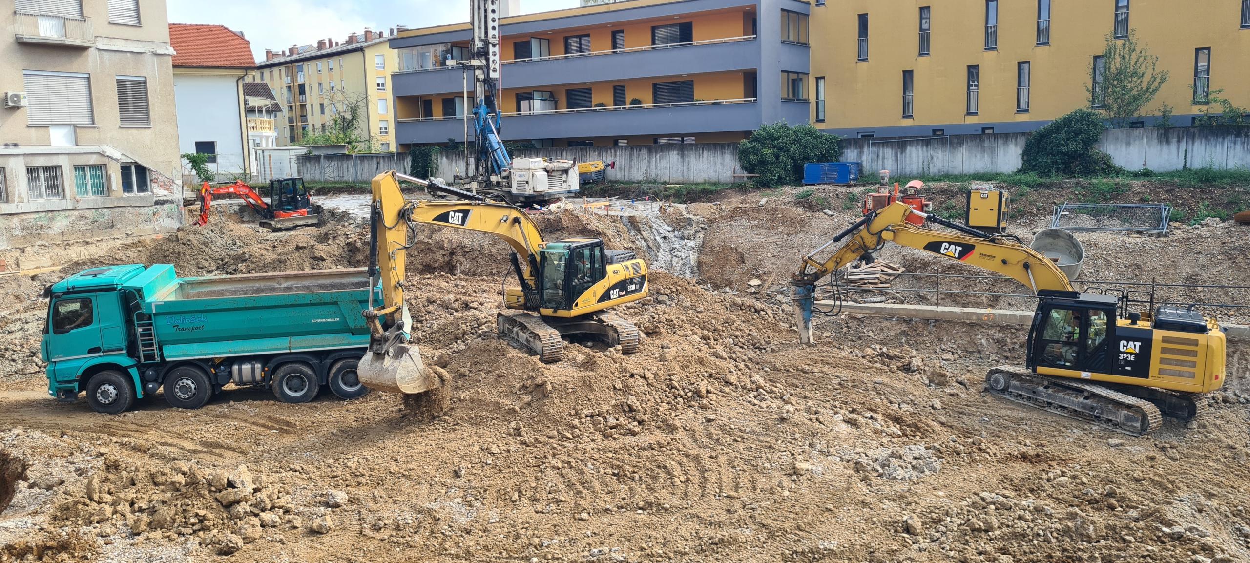 Globina gradbene jame sega do kota podtalnice, zato so zemeljska dela spremljala geotehnična dela z vodnjaki. Skupni volumen izkopa presega 60.000 m³. Zaradi zahtevnosti izkopa dela izvajamo s TGM in hidravličnimi kladivi nad 1,8t.